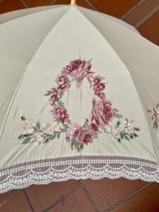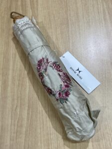 花の刺繍を施した晴雨兼用折り畳み傘で